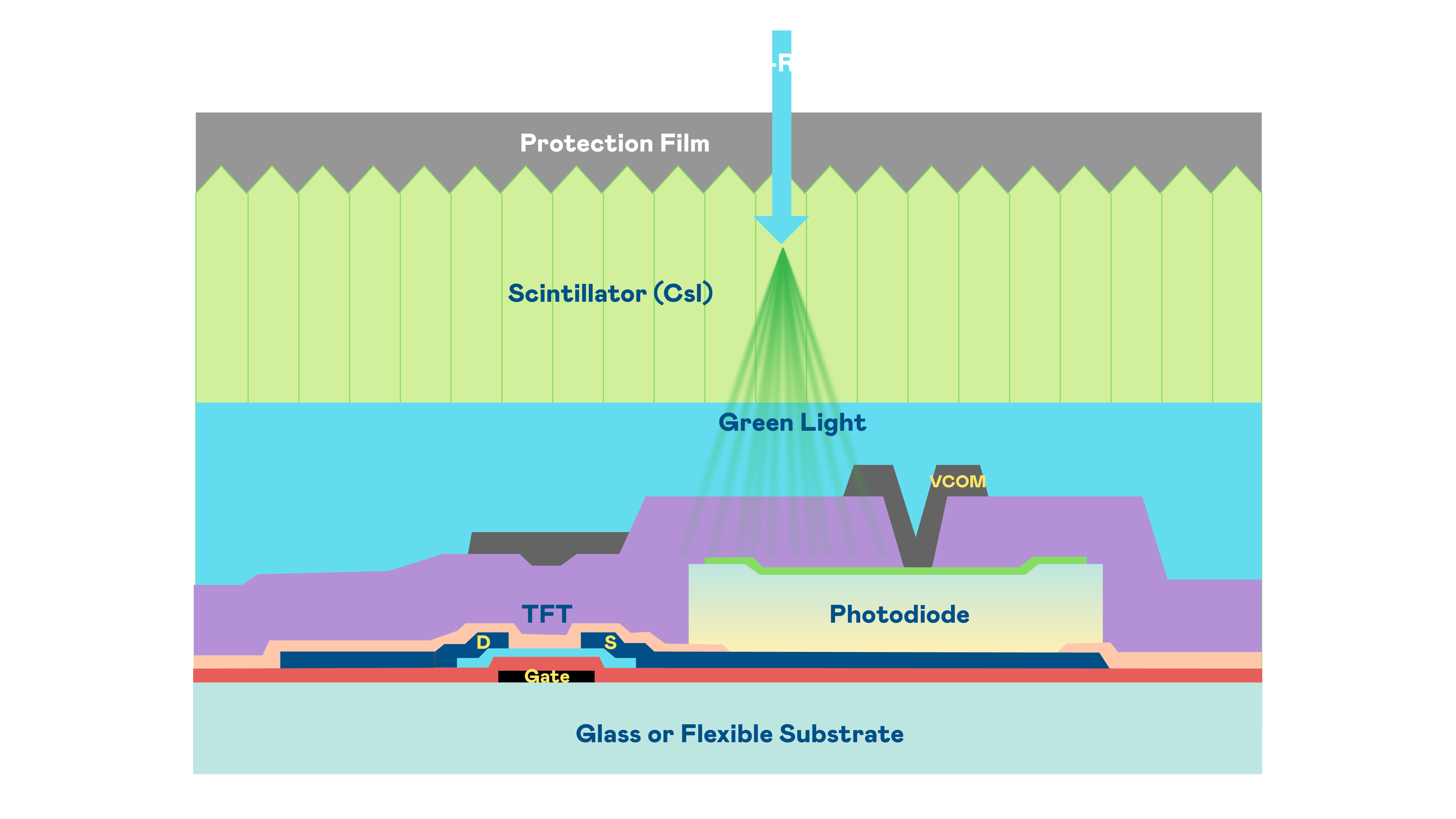 AG庄闲的X光影像感测阵列使用薄膜电晶体 (TFT) 作为每个像素的读取开关,搭配光电二极体(Photodiode)的光电转换元件,用以感测X光影像讯号。